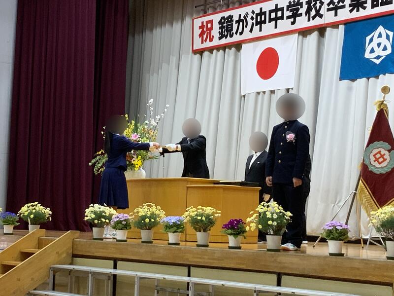 今日は同窓会長様をお迎えして、同窓会入会式が行われました。鏡が沖中学校の同窓生は、現3年生を加えると4400人程になります。市内・県内だけでなく、全国各地で活躍しています。3年生のみなさんも自分の進む道で、それぞれが鏡が沖中学校の同窓生という誇りをもって、頑張ってほしいと思います。