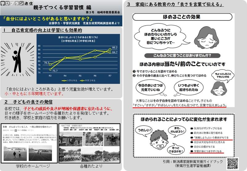 今週は保護者面談で、保護者の皆様からご来校いただき、学級担任と学校での様子やご家庭での様子について情報交換をさせていただいています。柏崎市教育委員会から「学びプラン通信」が発行され、第2号では「親子で作る学習習慣」が特集されています。全国的にも家庭学習時間の減少が大きな話題になっています。学校では、授業と関係した宿題、AIドリルを使った宿題、受験対策教材に取り組んでいます。ご家庭では、「日々の小さな関わり」が大切とのことです。声をかけたり、話を聞いたりする時間が、子どもに安心と自信を与えます。さりげない関わりが、学ぶ意欲を育て、家庭学習の習慣へとつながります。ご協力をお願いします。