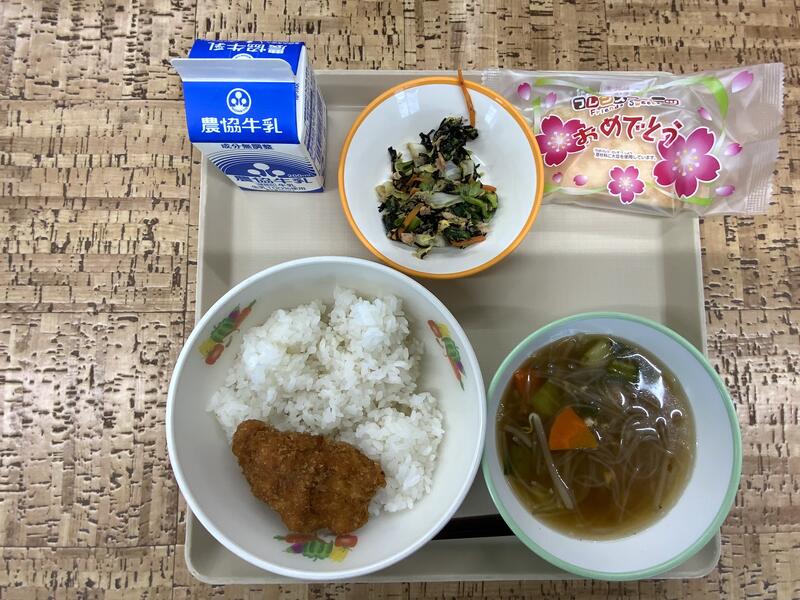 今日の給食は3年生の「もう一度食べたい給食のリクエストメニュー」で、チキンたれかつ丼、のり酢あえ、春雨スープ、お祝いクレープ、牛乳でした。3年生は、小学校から9年間、毎日のように食べていた給食。今日が最後の給食でした。毎日のメニューを考えてくださった栄養士さん、調理してくれる調理員さん、準備・後片付けを手伝ってくれる配膳員さんなど、多くの人に支えられて給食を食べることができました。もう食べられなくなるのは残念ですが、感謝の気持ちをもって最後の給食を味わうことができました。