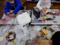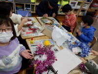親子活動「ミニ運動会」の後に、親子でリースの原型を作って準備をしていただいたおかげで、どの子も楽しみながら制作しました。松ぼっくりなどの木の実、リボン、モールなどを使って飾りつけをし、心のこもった個性豊かなリースが完成しました。家庭で飾っていただけると嬉しいです。