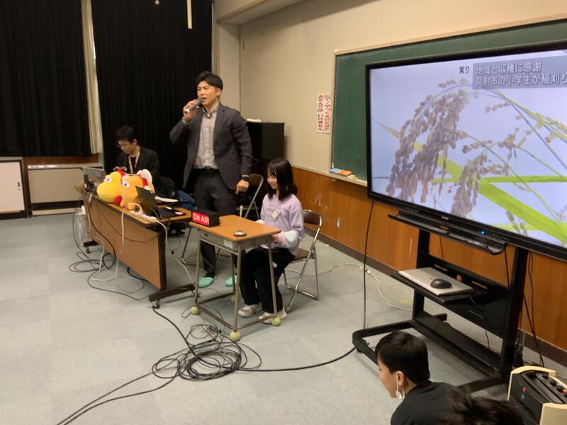 12月4日(木)の5・6限にテレビ局「UX新潟テレビ21」の方からおいでいただき、テレビ局の仕事についてお話を聞かせていただきました。土曜日の9:30から放映されている「まるどりっ!UP」に出演されている柏崎市出身の大角怜司アナウンサーはじめ3人の方が来てくださいました。
