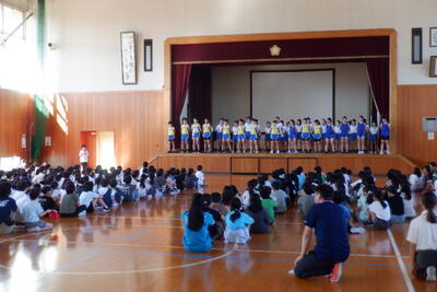 6年生代表2名が、陸上大会に向けた目標を発表したり、5年生を中心とした全校児童による応援をしたりしました。
