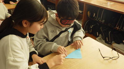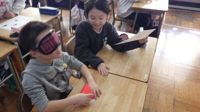 1つ目は、「折り紙」です。アイマスクをした状態で折り紙を折る・・・それをサポートする。指示語を多用しても伝わらないことが分かりました。