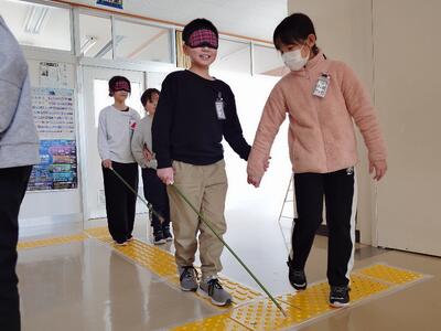 2つ目は、「ブラインドウォーク」です。「白杖(はくじょう)」に見立てた杖を使い、点字ブロックの上を歩く・・・それをサポートする。自分が今いる場所が分からず、予期せぬところから声がする。頼りは足の裏の感覚、杖が何かにぶつかる音(その変化)。