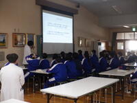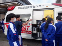 柏崎市の医師派遣事業で災害拠点病院の柏崎総合医療センターの医師らが来校し、災害医療の実際について講話をしていただきました。災害派遣医療チームDMAT(Disaster Medical Assistance Team)の車両に乗車させていただき、災害発生直後の医療現場の姿をイメージしました。