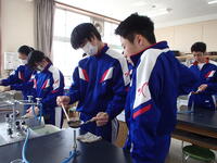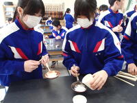 2年生理科の実験の様子です。砂糖と炭酸水素ナトリウム(重曹)の加熱実験で、カルメ焼きを体験しました。ガスバーナーの火力の加減が難しかったようで、苦戦していたようでした。実験後は、カルメ焼きとべっこう飴を味わいました。