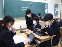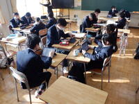 3年生の技術の授業風景です。新しいタブレットで、「マイクロビット(micro:bit)」アプリを活用してプログラミングを学んでいます。光らせたり、音を鳴らしたりなど、プログラミングを楽しんでいました。