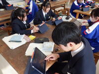 3年生の技術の授業風景です。新しいタブレットで、「マイクロビット(micro:bit)」アプリを活用してプログラミングを学んでいます。光らせたり、音を鳴らしたりなど、プログラミングを楽しんでいました。