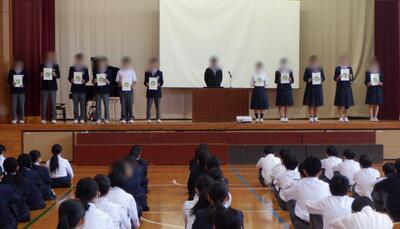 14日(火)後期学級委員長と学級副委員長の認証式を行いました。これからの半年間、学年学級のリーダーとなる生徒たちです。後期も生徒会や学校行事がたくさん予定されています。また、普段の生活の中でも、より高みを目指した取組を期待しています。