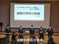 11月19日(水)、瑞穂中学校区小中学校「いじめ見逃しゼロスクール集会」絆つくり集会を実施しました。学区の小学校6年生が瑞穂中学校に集まり、一緒にいじめ問題について考えました。 最初の全体会では、それぞれの学校で取り組んでいる、いじめの未然防止と見逃しゼロへの取組について発表し合いました。次に各教室等で小グループに分かれて話し合いを行いました。今年のテーマは「やばい!」と言われたときの感じ方です。発する人、受け取る人やそのシチュエーションによっても全く違う意味にもなり得る言葉のむづかしさを感じながら児童生徒たちは自分の考えを発言していました。 ご参会いただきました地域、保護者の皆様、児童生徒と一緒になって考えていただきありがとうございました。