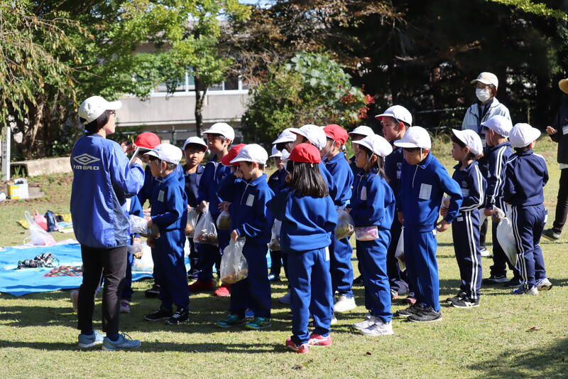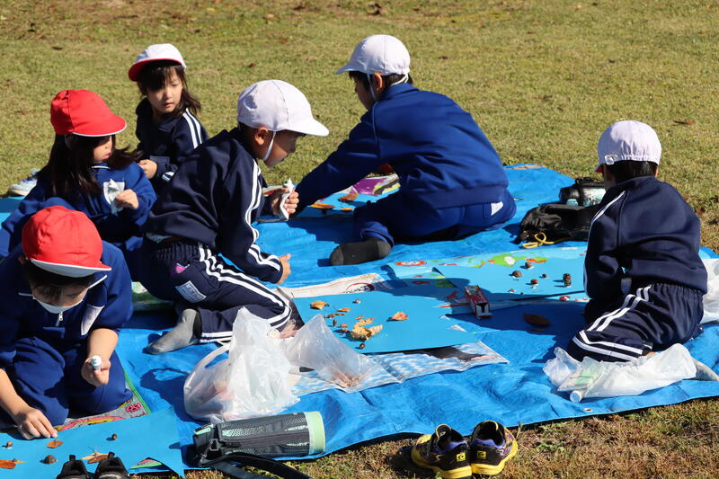 雲一つない青空の日でした。二田小学校の1年生と内郷の丘で過ごしました。落ち葉やどんぐり、木の枝等を画用紙に貼り付け、個性豊かな王冠を作りました。