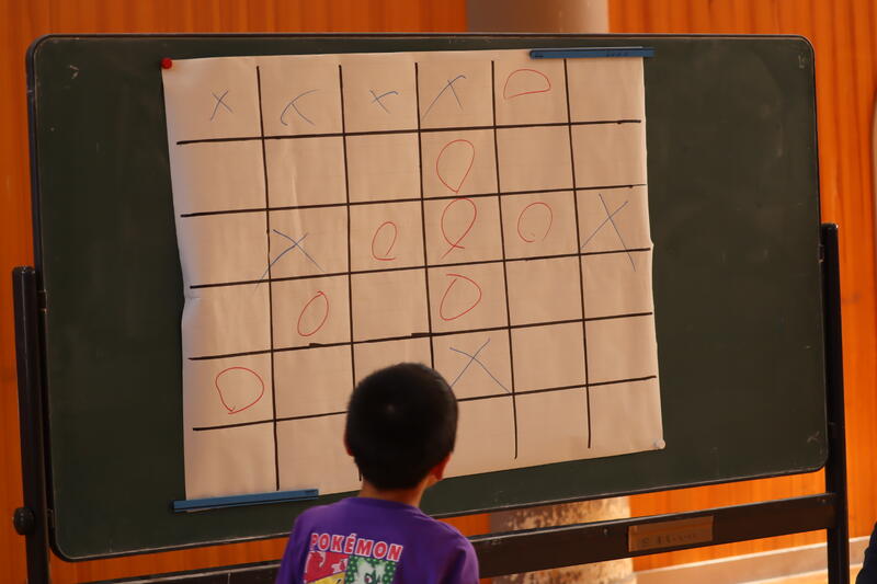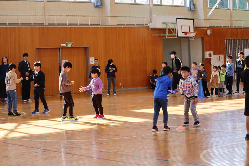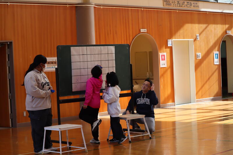 児童会の健康委員会が、秋のスポーツ大会として「リレーで〇✕ゲーム」を企画し、全校で楽しみました。2チーム対抗のリレーで、先に〇や✕の印を5つ並べたチームの勝ちです。途中でジャンケンゾーンがあり、ジャンケンで勝つまで印がつけられません。運だけでなく頭も使うゲームでした。