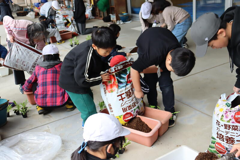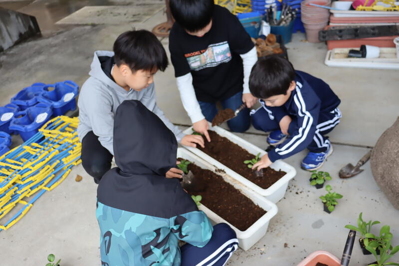 卒業式や入学式に飾る花の苗植えをしました。ふたわ班で協力してプランターに土を入れ、やさしく苗を植えました。夏前に植えた花とともに大事に育てていきます。