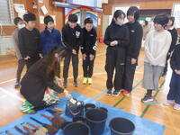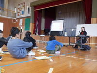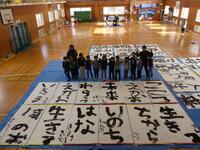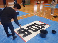 11月25日(火)と12月9日(火)の2回、書家の下田彩水先生からお越しいただき「夢授業」を行いました。第1部は、下田先生の生き方について講話をいただきました。幼少期から様々なことに打ち込んでいたということですが、最終的には、自分の心と向き合い、書家になったそうです。子どもたちの心にも響いたようで、真剣に話を聞いていました。その後、下田先生のパフォーマンスによる巨大書を書いていただきました。子どもたちが考えた「夢・挑戦」という文字を書いていただき、そのデザイン性にみんなでびっくりしました。