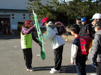 3月12日(木)の朝、日頃より登校の見守り及び引率をしてくださっている辻沢様に感謝の気持ちを込めて、のぼり旗に全校児童のサインをして贈呈しました。辻沢様は、登校の支援だけでなく、水泳監視などでも支援をいただき、感謝しきれません。