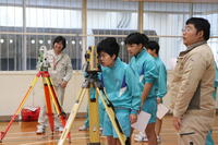 後半は体育館で、光波測距儀やレーザースキャナーを用いた測量や、ドローン操作の体験をしました。
