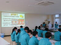 また、この日に先立って前日の給食の時間に、給食委員会が全校生徒へ向けて地産地消についてレクチャーしました。
