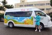 西山中学校では、北エリアを走るあいくる11号車のお披露目が、玄関前の駐車場で行われました。