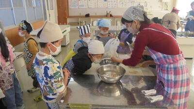 高学年は家庭科の学習でお米を炊きました。柏崎の「米山プリンセス」と新潟の「新之助」をそれぞれ炊いて食べ比べをするのだそうです。自分で作ったエプロンを身に着けている子供もいました。火加減をじっと見て、おいしそうに上手に炊くことができました。