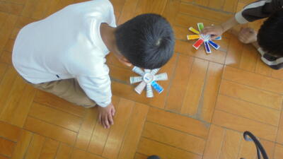 2年生が1年生を招待しておもちゃやさんを経営しました。全部で5つもお店があります。説明から記録から切り盛りする2年生立派でした。1年生もすごく喜んで、楽しんでいました。