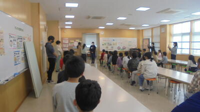 今日は6年生と1・2年生が一緒に給食を食べるハッピー給食です。5・6年生は普段は教室で食べています。5年生が6年生の好きな曲をイントロクイズで紹介するなど、和やかな雰囲気で食べていました。明日は3・4年生と食べます。