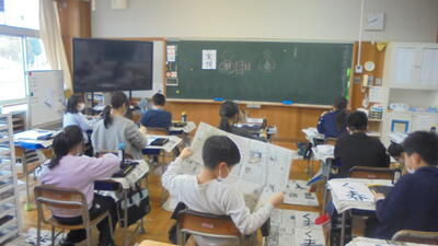 もうすぐ冬休み。冬休み明けは、いつも全校書初め大会を行っています。毎年、上国連の課題に挑戦しています。今年は5年生は「近づく春」6年生は「夢の実現」です。少しずつ、文字のバランスなどに気を付けて練習を開始しました。高学年は、まずは二文字ずつ半紙に練習をしました。一生懸命書く子供たちです。