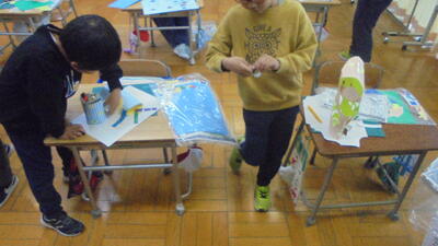 1年生は大切に育てたあさがおのつるを今度はリースに生まれ変わらせました。つるをまあるく形づくって、思い思いの飾りつけをしていきます。それぞれの家で素敵に飾られることでしょう。