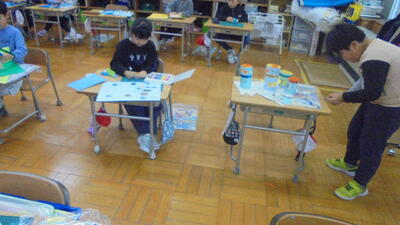1時間目の授業をのぞいてみると、2年生は国語の説明文の学習をしていました。説明文の仕組みや内容をみんなで考えています。教室の後ろには2年生がかわいがっているウサギさんがのんびりしていました。1年生は生活科の学習で、秋の葉っぱや実を使っておもちゃなどを作っていました。「楽しい!」と言いながら、みんな夢中で活動している朝の様子です。