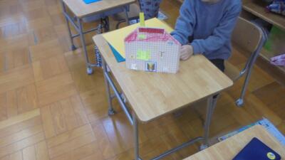 低学年は工作「まどのあるたてもの」の学習をしていました。カッター等を安全に用いて、自分の考える建物を工作用紙でつくる学習です。「窓からどんなものが見えるかなあ」「窓をどんな形にしようかな」と考えながら表現を楽しんでいました。