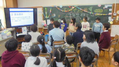 中学年は柏崎野菜の学習の中で、「与板菜」「仙人菊」「土垂芋」を育てたり調べたりしました。今日はその成果を収穫祭として、柏崎野菜を使った料理を作ったり、関わった地域の方々を招いて発表会をしたりしました。とてもよく調べていて初めて知ったことも多かったです。地域の野菜を知ることで、地域のよさを学び、地域のことをもっともっと好きになってほしいです。