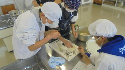 高学年は、家庭科のお味噌汁づくりに挑戦です。ねぎとわかめと豆腐でお味噌汁を作ります。にぼしだしで、にぼしの頭をしっかりと取っていました。手順よく、お水もしっかりと測る子供たち。家でもお手伝いできるといいですね。