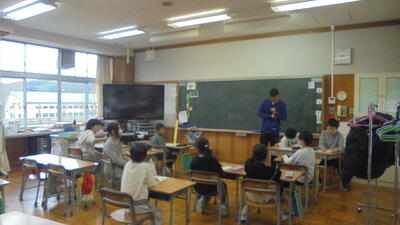 1時間目の授業をのぞいてみると、2年生は国語の説明文の学習をしていました。説明文の仕組みや内容をみんなで考えています。教室の後ろには2年生がかわいがっているウサギさんがのんびりしていました。1年生は生活科の学習で、秋の葉っぱや実を使っておもちゃなどを作っていました。「楽しい!」と言いながら、みんな夢中で活動している朝の様子です。