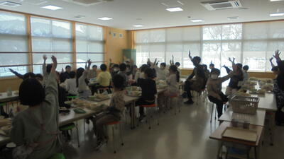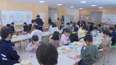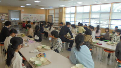 今日は6年生と1・2年生が一緒に給食を食べるハッピー給食です。5・6年生は普段は教室で食べています。5年生が6年生の好きな曲をイントロクイズで紹介するなど、和やかな雰囲気で食べていました。明日は3・4年生と食べます。