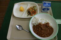 久しぶりに給食の写真をアップします。今日の給食は、キーマカレー(麦ごはん)、茎わかめのサラダ、新道の柿、牛乳でした。おいしくいただきました。
