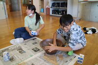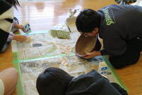 10月23日、5年生は一人一人がバケツ稲に挑戦していました。収穫後、プールの柵で天日干し。今日は、脱穀した後の作業、籾すりを行っていました。すり鉢を使って、ソフトバールの堅い球で転がしてすりつぶしていました。難しい作業をグループになって黙々と取り組んでいました。時折、息を吹きかけ、米粒ともみ殻を分ける様子が見えました。5年生がんばっています。