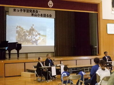 午前の部の第二部は、「米山小を語る会」です。記念事業実行委員の皆様に進行していただき、5名のパネラーの皆様から米山小学校での思い出を語っていただきました。時代と共に変わってきたもの、変わらないものなど、懐かしさや驚きを感じながらお聞きしました。会場の皆様からも質問や補足などがあり、和やかで楽しい時間になりました。