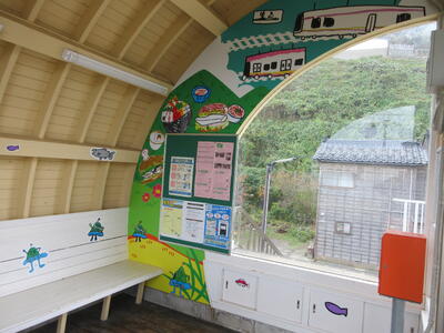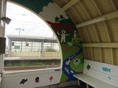 25日(土)の午後は、笠島駅の待合室のお披露目会でした。JR東日本新潟支社や新潟工科大学、NPO法人aisa、不二美術印刷の協力を得ながら、児童が考えた米山地区の魅力を散りばめたラッピングが完成し、保護者や地域の皆様に見ていただきました。「すごい!」「かわいい」と多くの皆様から声を掛けていただきました。地域の魅力を発信する場所になり、電車を利用する方が喜んでくださるとうれしいです。