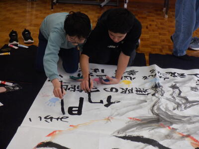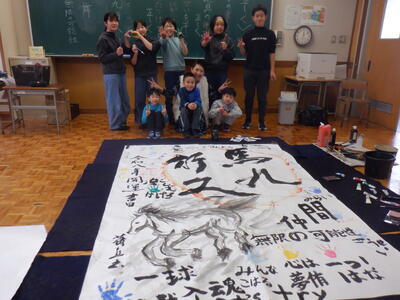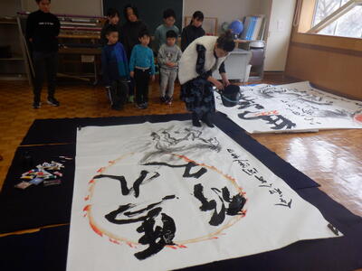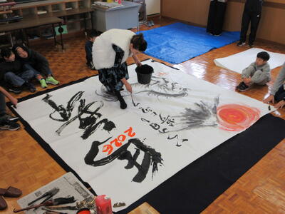書初めの指導をしてくださった佐藤絵美先生から書道パフォーマンスを披露していただきました。子どもたちは、初めて接する書道パフォーマンスを食い入るように見つめていました。一枚目は、「馬舞」という文字と、「いつの日も夢に向かって突き進む」という子どもたちへのメッセージをしたためてくださいました。二枚目は、迫力の「馬九行久(うまくいく)」の文字に、子どもたちも手形を押したり、言葉を書いたりと作品作りに参加させてもらいました。躍動感のある墨絵の馬と合わさって、すてきな作品に仕上がりました。普段、経験することのできない貴重な書道パフォーマンスに触れることができ、忘れられない思い出になりました。佐藤先生、大変ありがとうございました。