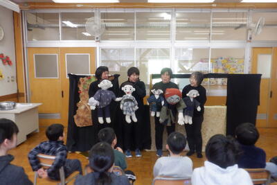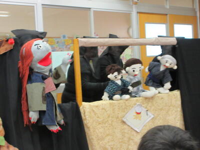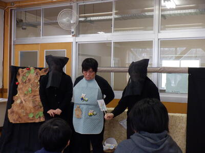 19日(木)、地域の人形劇サークル「てるてるクラブ」の皆さんが来校して、エプロンシアターと人形劇を披露してくださいました。エプロンシアターの演目は、「三匹の子ぶた」でした。絵本で知っている内容も、エプロンシアターだと一味違った感じになります。子ぶたや狼の人形がかわいかったです。人形劇は、「天の神様 金綱ください」という話でした。これまでイメージしていた人形よりも数倍大きく、迫力のある山姥が印象的でした。人形を動かす時は、指だけでなく、人形に付けた棒を操作することで様々な動きを表現していてすばらしかったです。