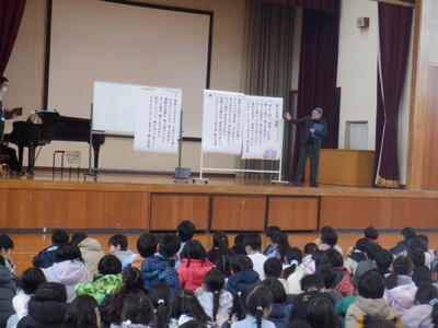 三校授業交流会 投稿日時 : 9:48 サイト管理者 21日(水)、今年度最後の授業交流会が剣野小学校で行われました。今回は、教頭先生に校舎を案内していただいたり、学年ごとに学習したりしました。加えて、4月からスタートする西小学校の校歌の練習を全校で行いました。作詞作曲をしてくださった今成満先生から、歌詞に込められた思いや歌い方のポイントなどを直接ご指導いただきました。各校とも練習を重ねてきたことが分かる元気な歌声が体育館に響き渡りました。気持ちを一つにして歌うことを通して、4月からの新しい生活が楽しみになったことと思います。 0 {{options.likeCount}} {{options.likeCount}} {{options.unlikeCount}} {{options.unlikeCount}}